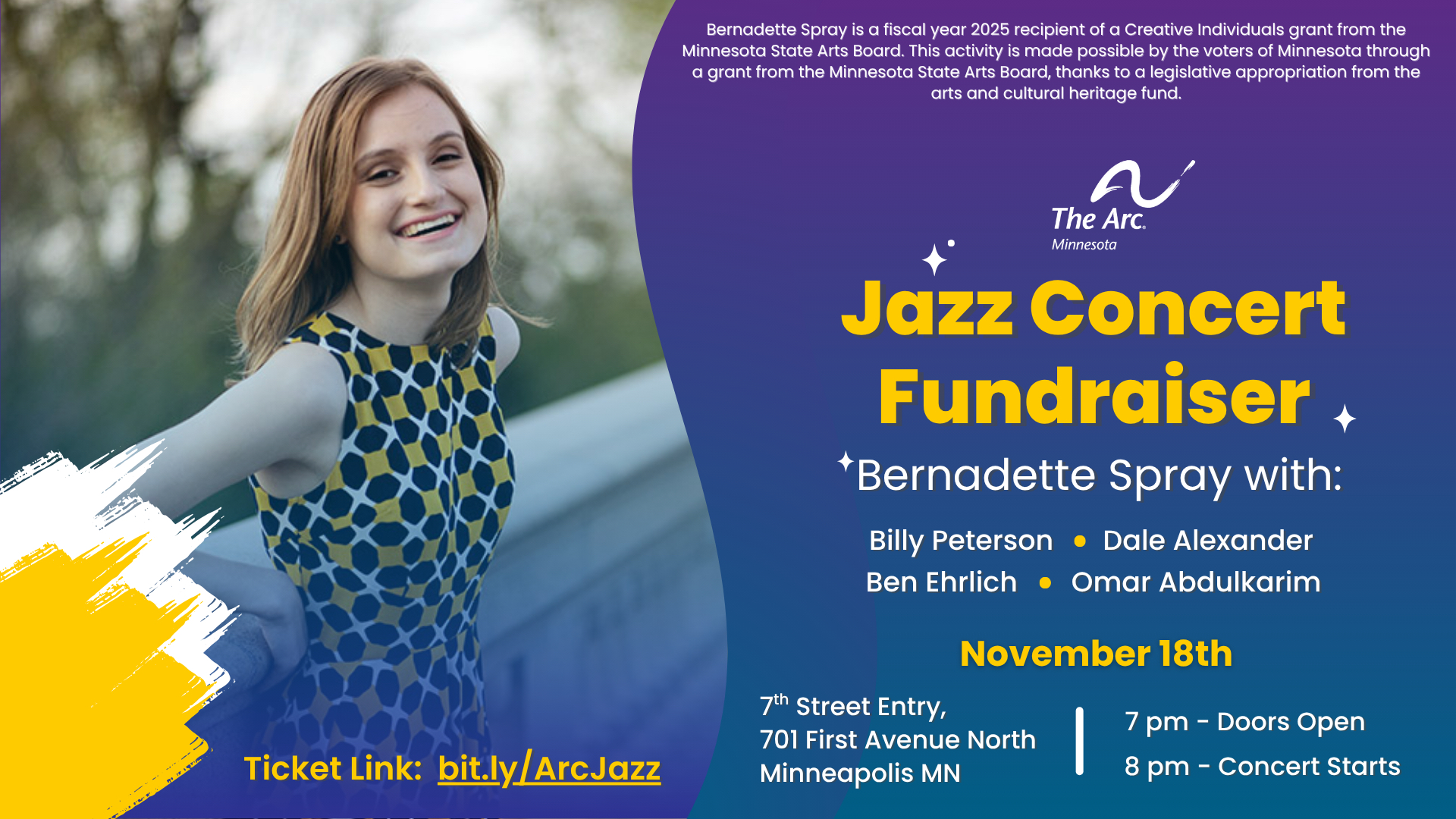 Please join us for a jazz concert featuring local artist Bernadette Spray and her band of talented musicians: Billy Peterson, Dale Alexander, Ben Ehrlich and Omar Abdulkarim. Bernadette, a gifted autistic jazz artist and recipient of a 2025 Creative Individuals grant from the Minnesota State Arts Board, is generously donating all proceeds from the event to The Arc Minnesota.